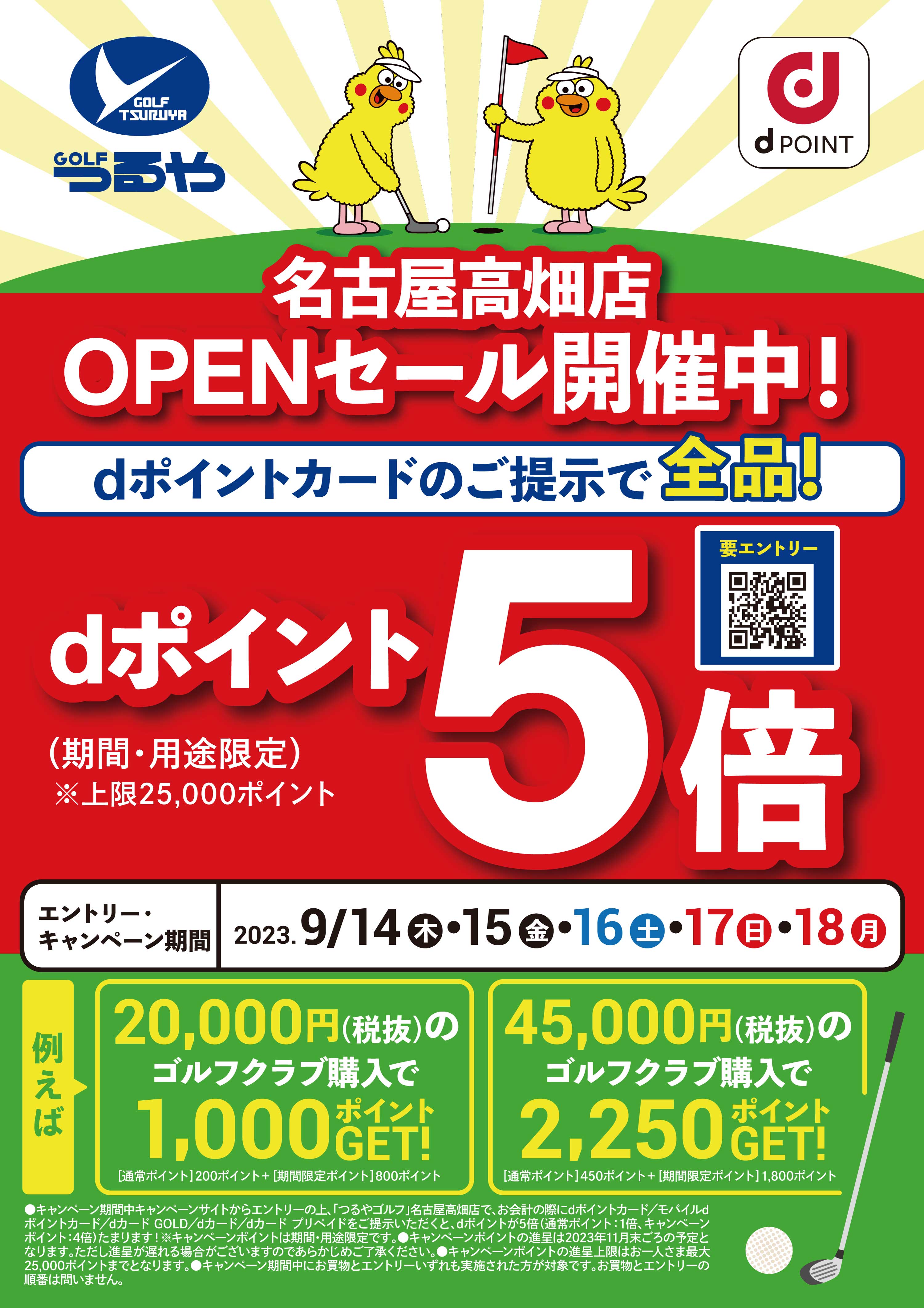 キャンペーン期間中キャンペーンサイトからエントリーの上、「つるやゴルフ」名古屋高畑店で、お会計の際にdポイントカード/モバイルdポイントカード/dカード GOLD/dカード/dカード プリペイドをご提示いただくと、dポイントが5倍(通常ポイント:1倍、キャンペーンポイント:4倍)たまります!※キャンペーンポイントは期間・用途限定です。