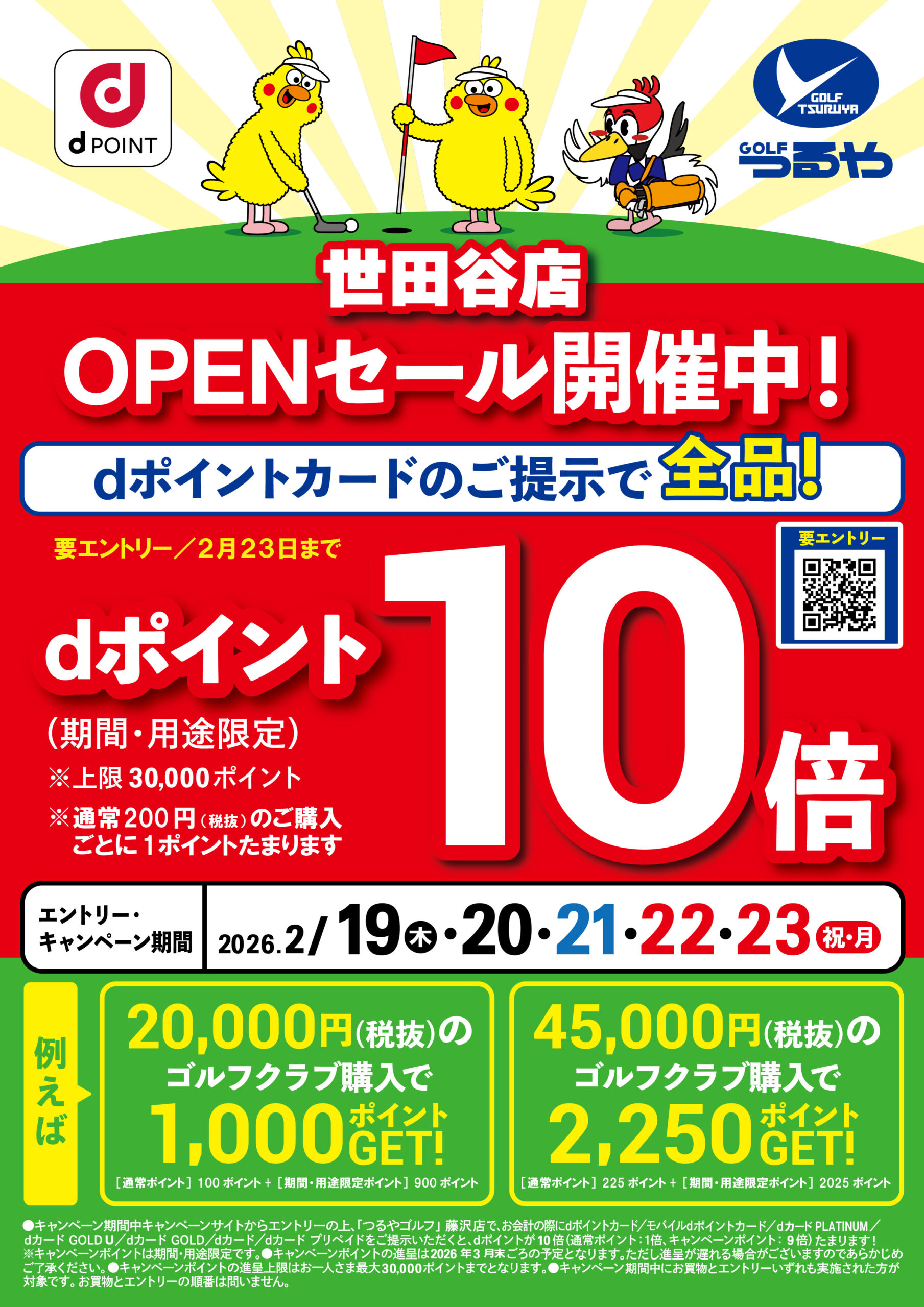 キャンペーン期間中キャンペーンサイトからエントリーの上、「つるやゴルフ」世田谷店で、お会計の際にdポイントカード/モバイルdポイントカード/dカード PLATINUM/dカード GOLD U/dカード GOLD/dカード/dカード プリペイドをご提示いただくと、dポイントが10倍(通常ポイント:1倍、キャンペーンポイント:9倍)たまります!※キャンペーンポイントは期間・用途限定です。