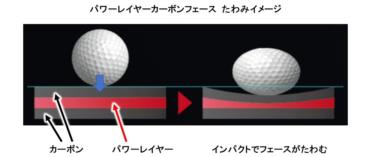 インパクトの時に中央部のパワーレイヤーが圧縮されることでカーボンをたわませることができ