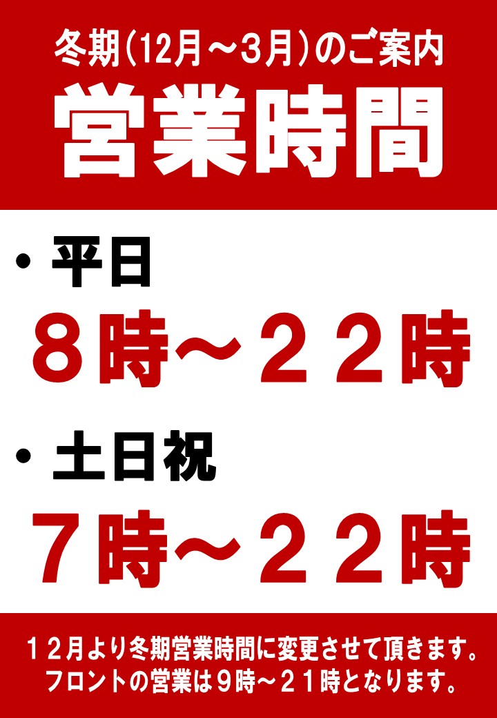 12月~3月 平日 8:00-22:00/土日祝 7:00-22:00- 【電話番号】