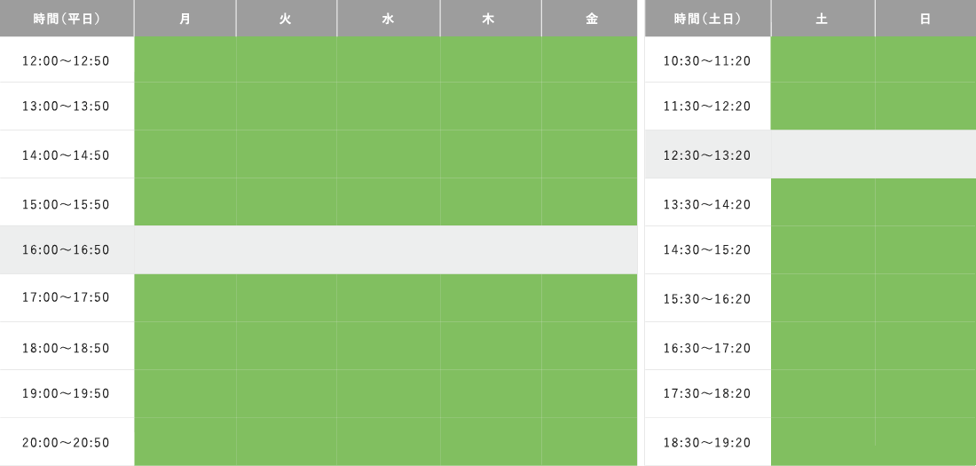 月〜金 12:00-20:50 土・日 10:30-19:20 |